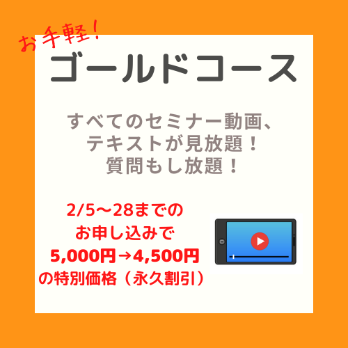 ゴールドメンバーは、過去の動画やテキストが全て見られて、メンバーSNSが利用でき、毎月の公式セミナー参加費が無料です。